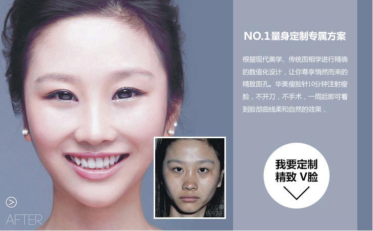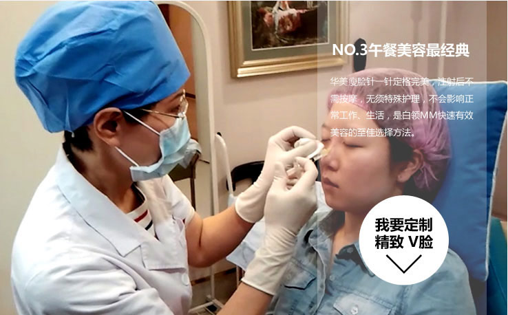 华美瘦脸针选用进口材料,由专家亲诊,定位注射位置,确定所需剂量,个性化设计,10分钟定制你的个性V型小脸。